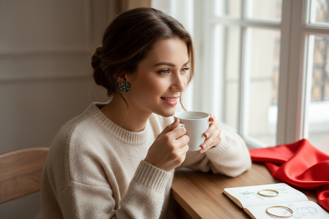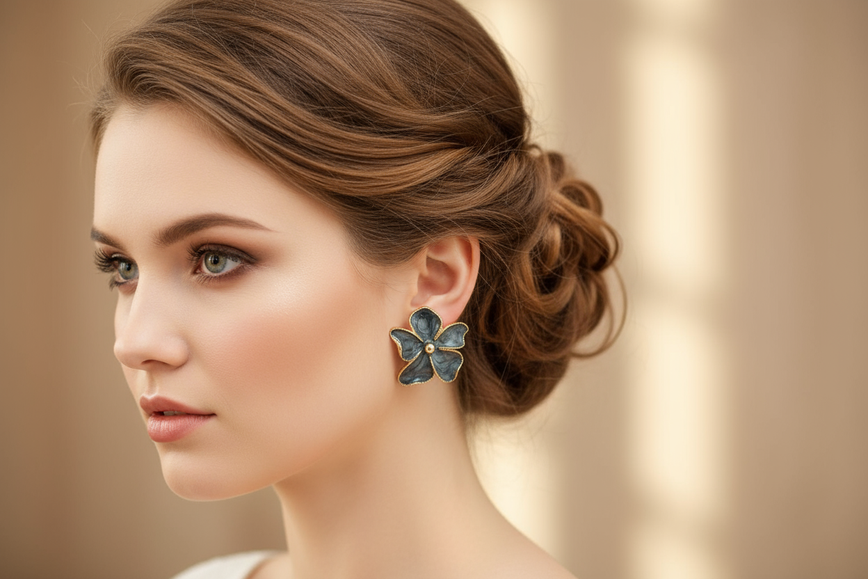 Elegant and mysterious, the Midnight Bloom Korean Floral Stud Earrings are designed for women who love subtle luxury. Featuring translucent charcoal-black floral petals with soft marble detailing, these earrings are finished with a delicate gold-tone outline and a polished golden center. The deep smoky shade paired with warm gold accents creates a refined contrast, making these studs perfect for evening wear, festive outfits, and modern ethnic looks. Inspired by flowers blooming under moonlight, the Midnight Bloom earrings offer a graceful blend of minimalism and glamour. The glossy resin petals catch light beautifully, while the intricate gold edging adds a couture finish. Lightweight and skin-friendly, they ensure comfort without compromising on style.
