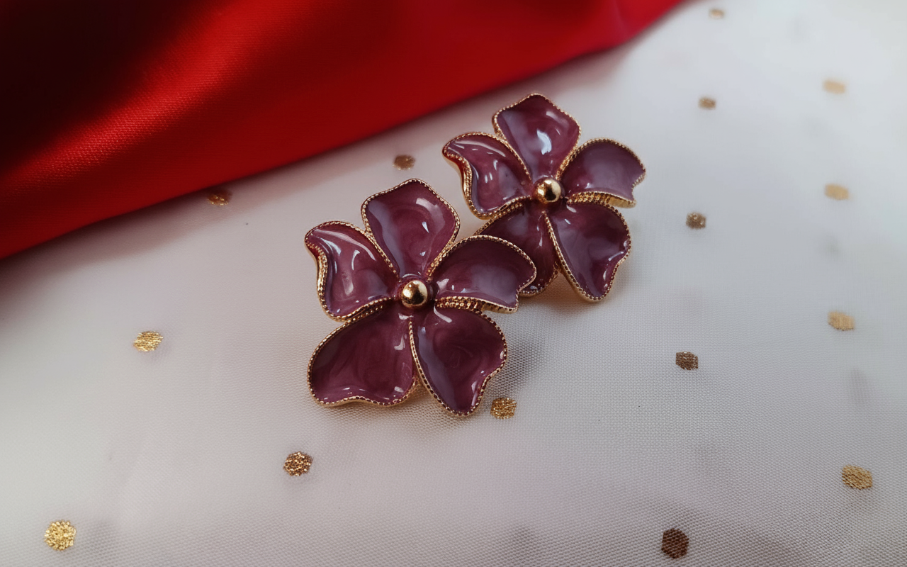 Elegant and mysterious, the Midnight Bloom Korean Floral Stud Earrings are designed for women who love subtle luxury. Featuring translucent charcoal-black floral petals with soft marble detailing, these earrings are finished with a delicate gold-tone outline and a polished golden center. The deep smoky shade paired with warm gold accents creates a refined contrast, making these studs perfect for evening wear, festive outfits, and modern ethnic looks. Inspired by flowers blooming under moonlight, the Midnight Bloom earrings offer a graceful blend of minimalism and glamour. The glossy resin petals catch light beautifully, while the intricate gold edging adds a couture finish. Lightweight and skin-friendly, they ensure comfort without compromising on style.